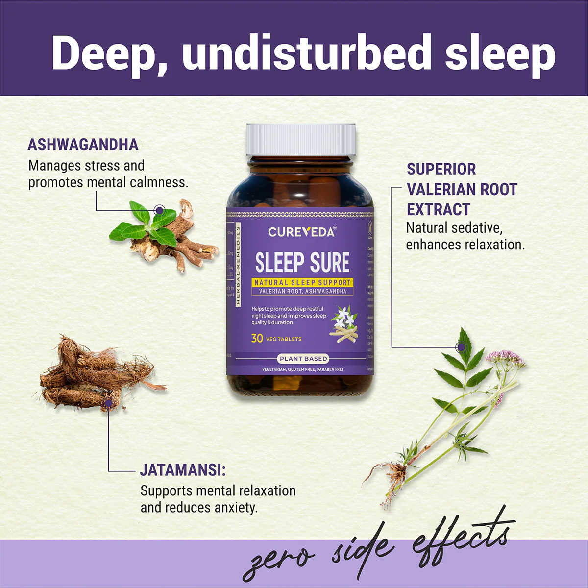 Cureveda Sleep Sure is built for anyone struggling to get quality rest. It blends time-tested herbs like Ashwagandha, Jatamansi, and Valerian root, all known to help calm the mind and promote better sleep. Whether it’s stress, racing thoughts, or irregular sleep patterns, this formula helps you ease into rest more naturally.